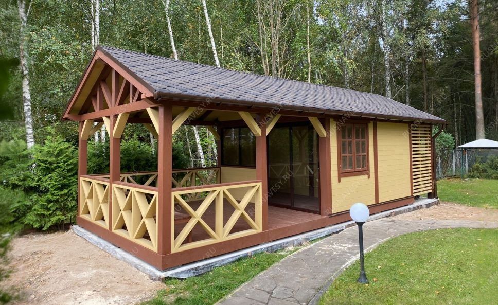 Конструкция изготовлена из хвойных пород древесины (ель, сосна). Материал — массив сухой строганный камерной сушки + клееный брус. В крепеже не используем черных саморезов, только желтопассированные. Крепеж не является сборно – разборным..