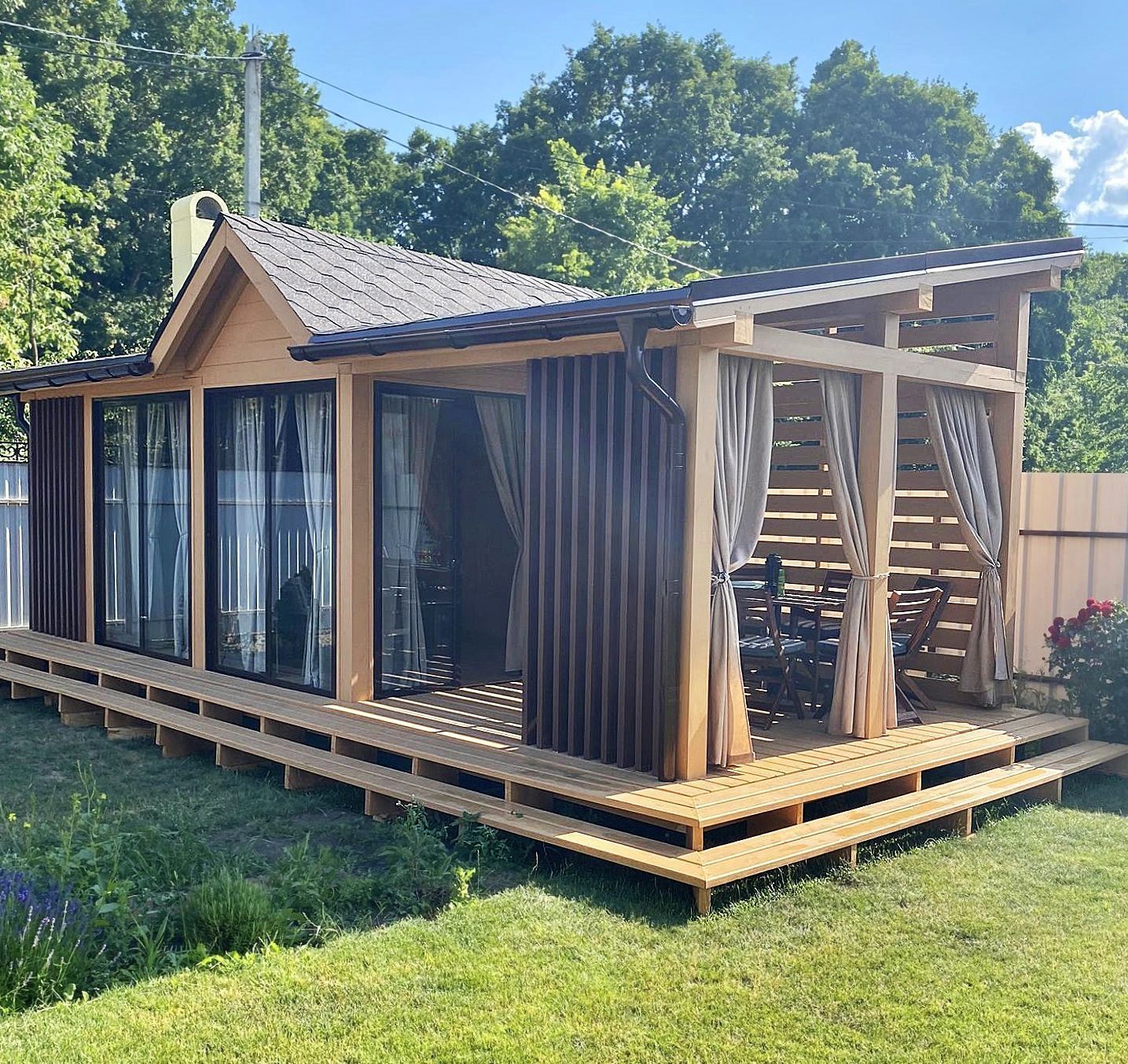 • Двускатный навес для классической симметрии и эффективного схода осадков.