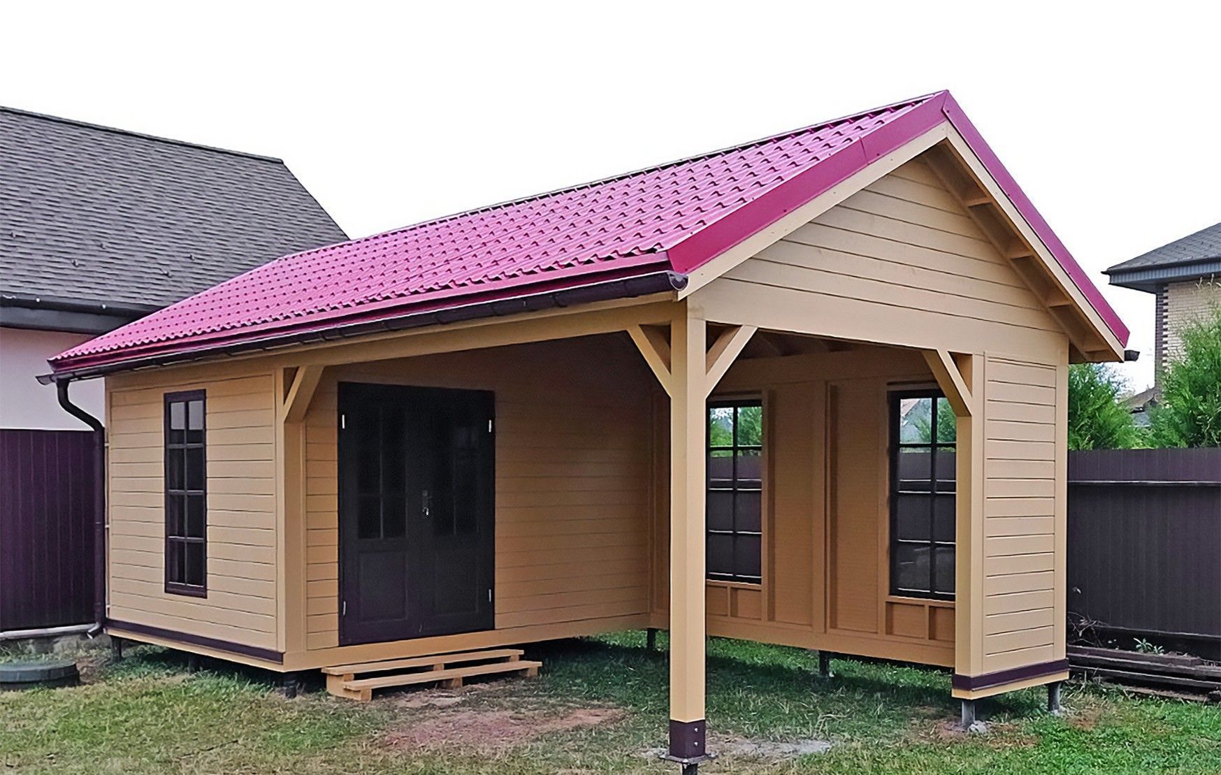 • Двускатный навес для классической симметрии и эффективного схода осадков.